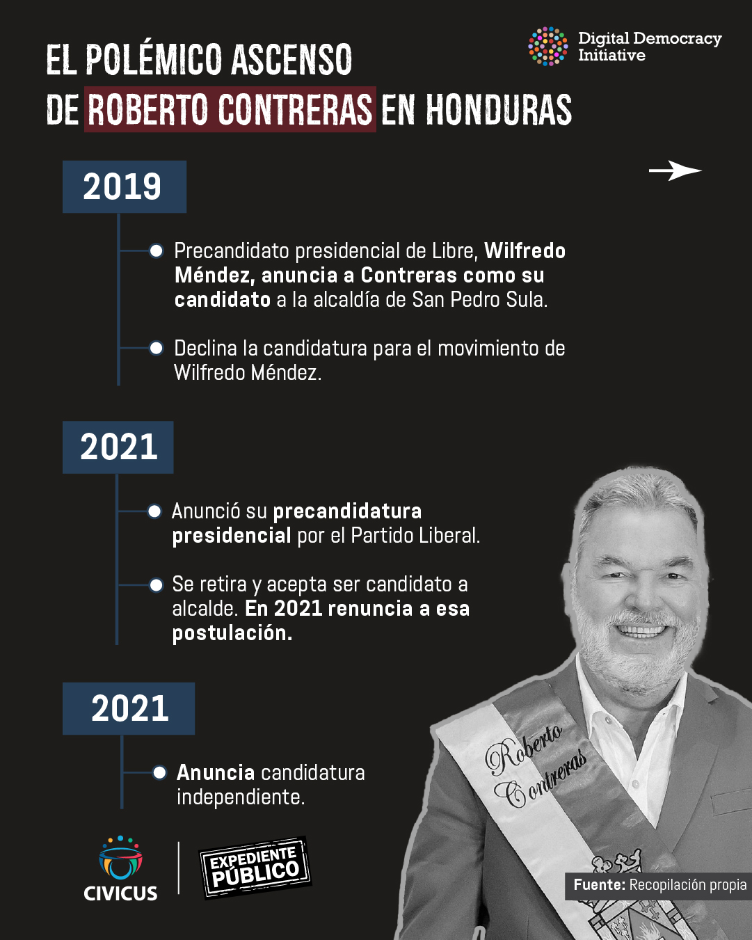 Las propuestas no le faltaban. El Partido Salvador de Honduras (PSH) le ofreció una candidatura, pero Contreras no aceptó asegurando que esa organización le haría perder simpatizantes. «Nos pidió que lo pusiéramos, lo pusimos y renunció. Es una persona que cambia bastante de opinión», recordaría más tarde Salvador Nasralla, entonces líder del PSH y ahora candidato presidencial liberal.
