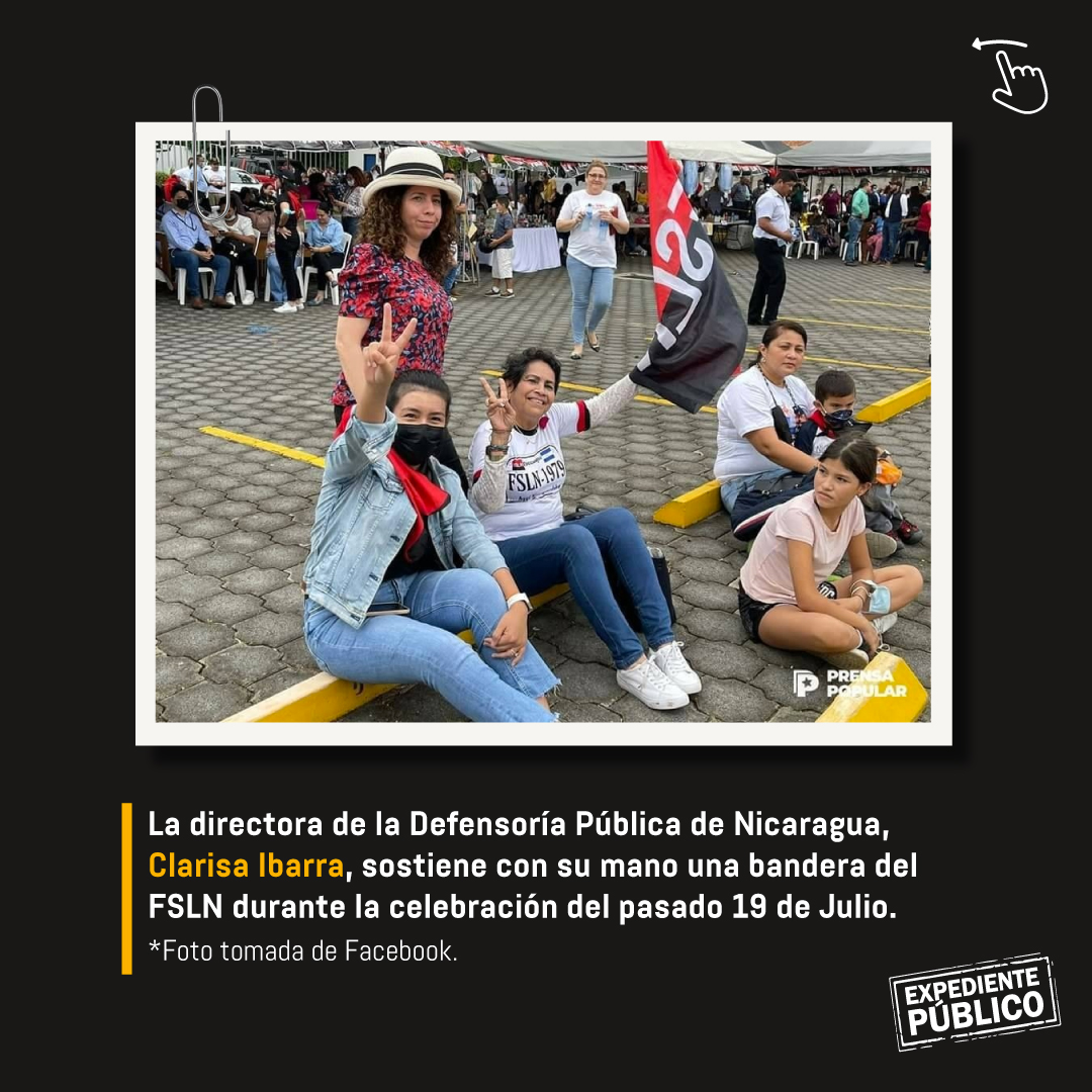 La Defensoría Pública es una institución que forma parte del Poder Judicial y es dirigida actualmente por Clarissa Indiana Ibarra Rivera, una funcionaria que fue vista el pasado 19 de julio con una bandera roja y negra en la mano celebrando el 43 aniversario del derrocamiento de la dictadura de Somoza y el triunfo de la revolución popular en Nicaragua.