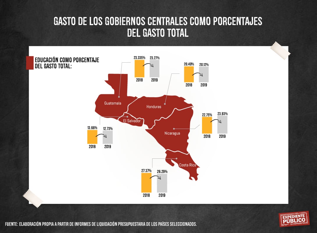 De acuerdo a las cifras de la Organización de las Naciones Unidas para la Educación, la Ciencia y la Cultura (UNESCO), actualizadas hasta 2017, Nicaragua es uno de los países centroamericanos que menos invierte en educación con el 4.36% del Producto Interno Bruto (PIB), tendencia que se ha mantenido en la última década en la que ha gobernado el sandinista Daniel Ortega. En contraste a ello, Costa Rica es a nivel regional donde más se invierte, con 6.7% de PIB.