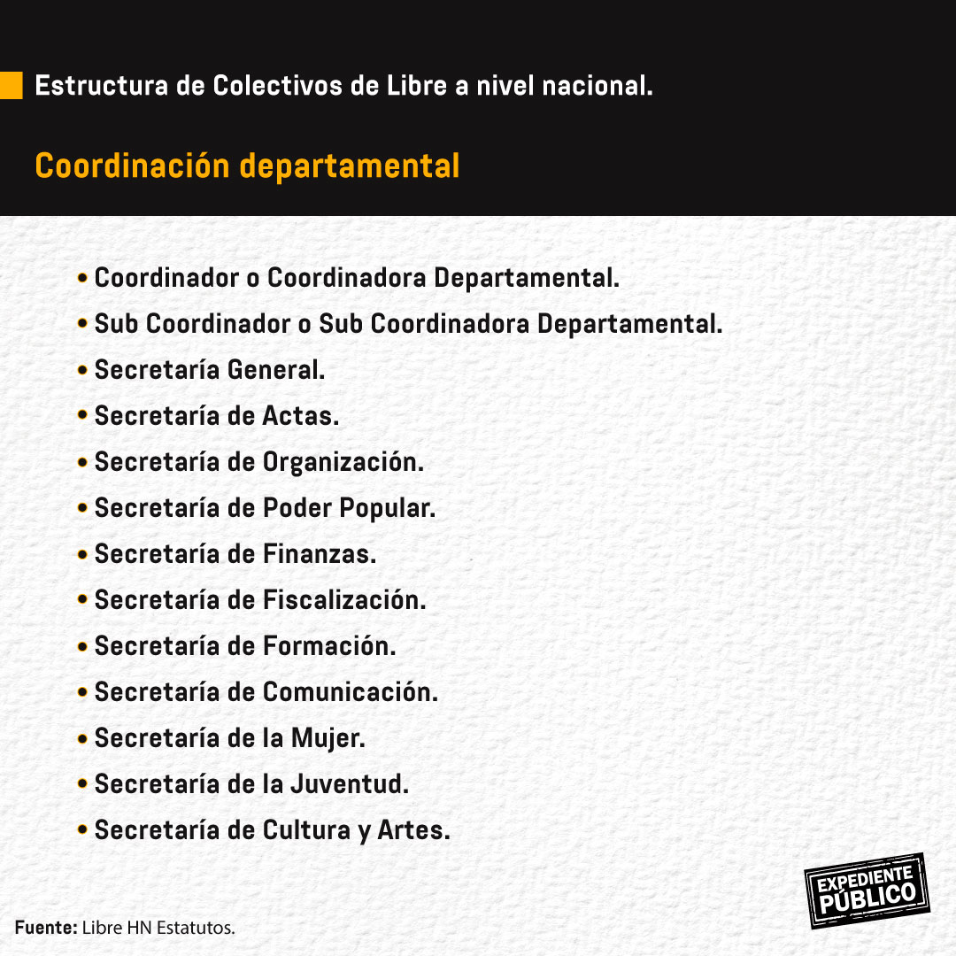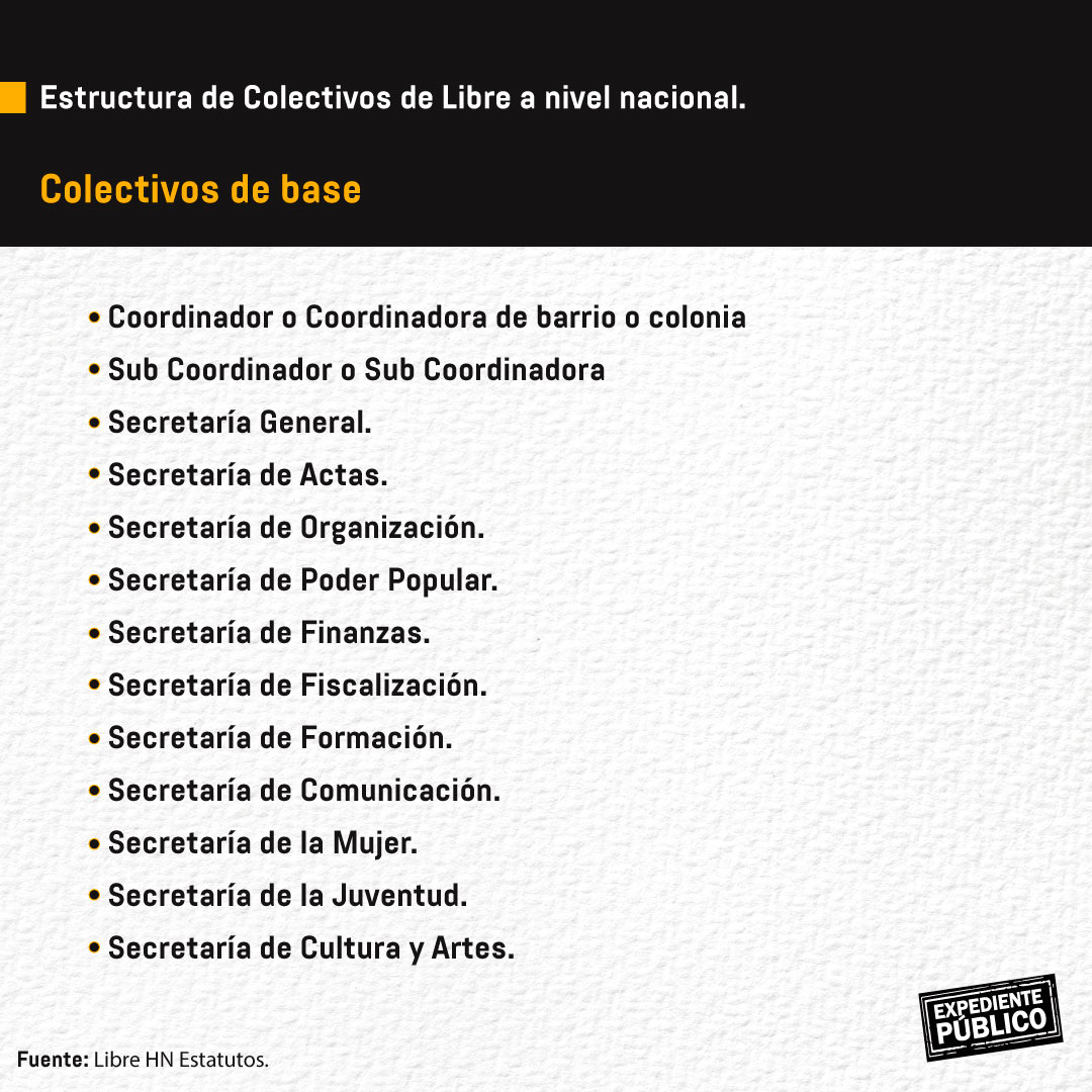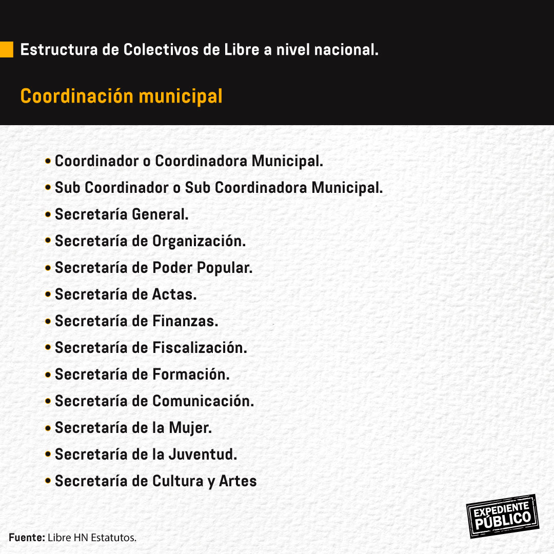 Asimismo, «el colectivo de base debe organizarse de la misma forma que la estructura de la Coordinación Municipal de Libertad y Refundación (LIBRE)”, reza el artículo 74.