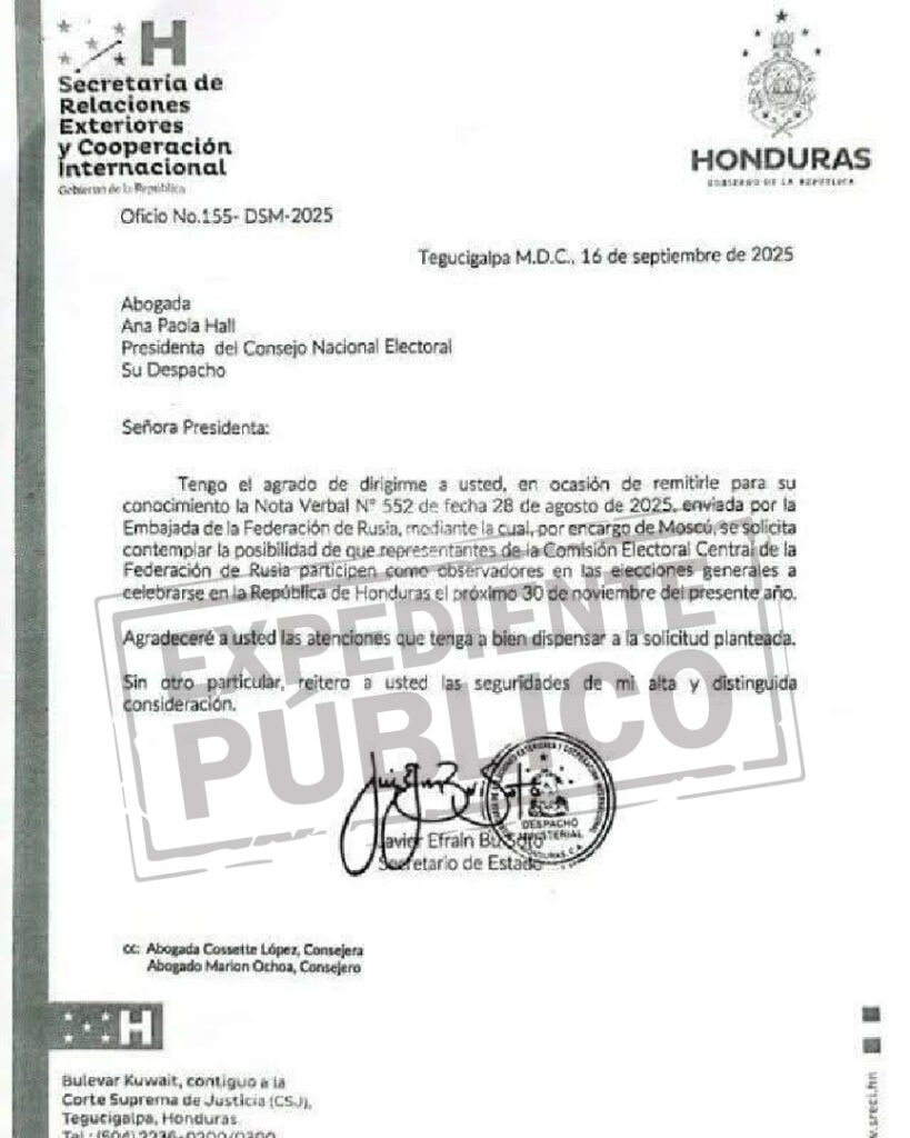 The Embassy of the Russian Federation submitted the request on August 28 to the Honduran Foreign Ministry, which forwarded it to the National Electoral Council (CNE) on September 16. The CNE has 10 business days to decide whether to allow the presence of these observers.