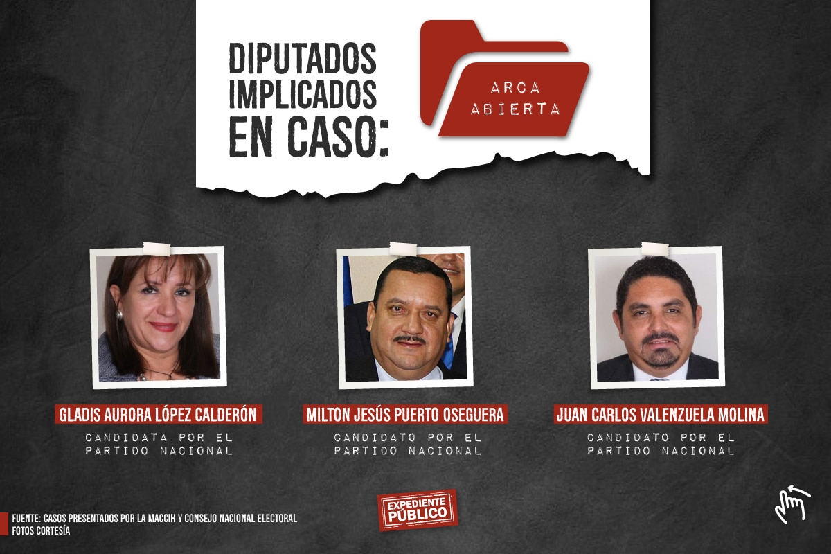 De los implicados del caso Arca Abierta, Gladis Aurora López Calderón, va como candidata a diputada en la primera posición del Partido Nacional; en la segunda posición participa Milton Jesús Puerto Oseguera y en la quinta posición participa Juan Carlos Valenzuela Molina; todos por el Partido Nacional.