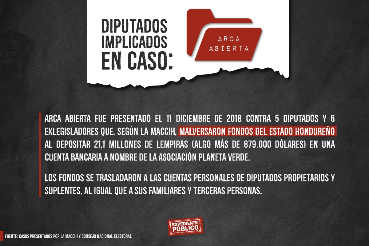 El caso Arca Abierta fue presentado el 11 diciembre de 2018 contra 5 diputados y 6 exdiputados hondureños que, según la Maccih, malversaron fondos del Estado hondureño al depositar 21,1 millones de lempiras (algo más de 879.000 dólares) en una cuenta bancaria a nombre de la Asociación Planeta Verde.