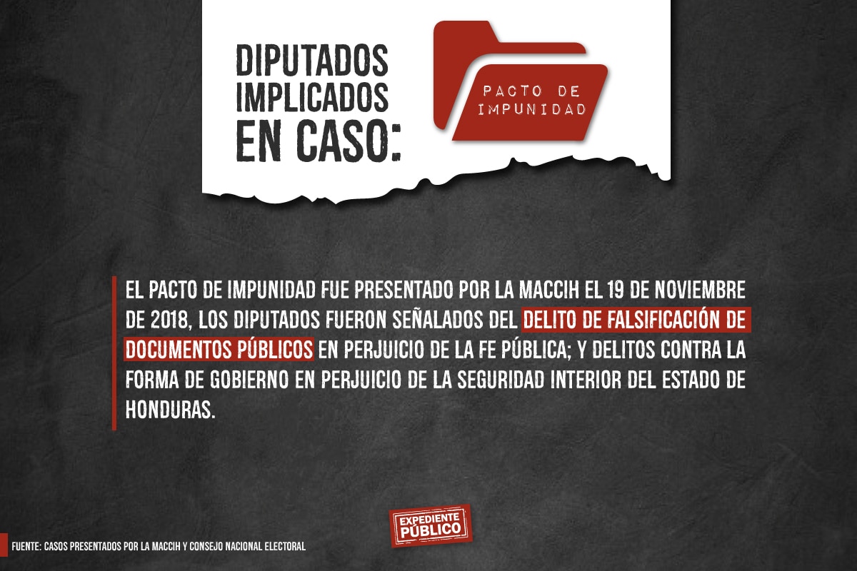 El pacto de Impunidad fue presentado por la Maccih el 19 de noviembre de 2018, los diputados fueron señalados del delito de falsificación de documentos públicos en perjuicio de la Fe Pública y delitos contra la forma de gobierno en perjuicio de la Seguridad Interior del Estado de Honduras.