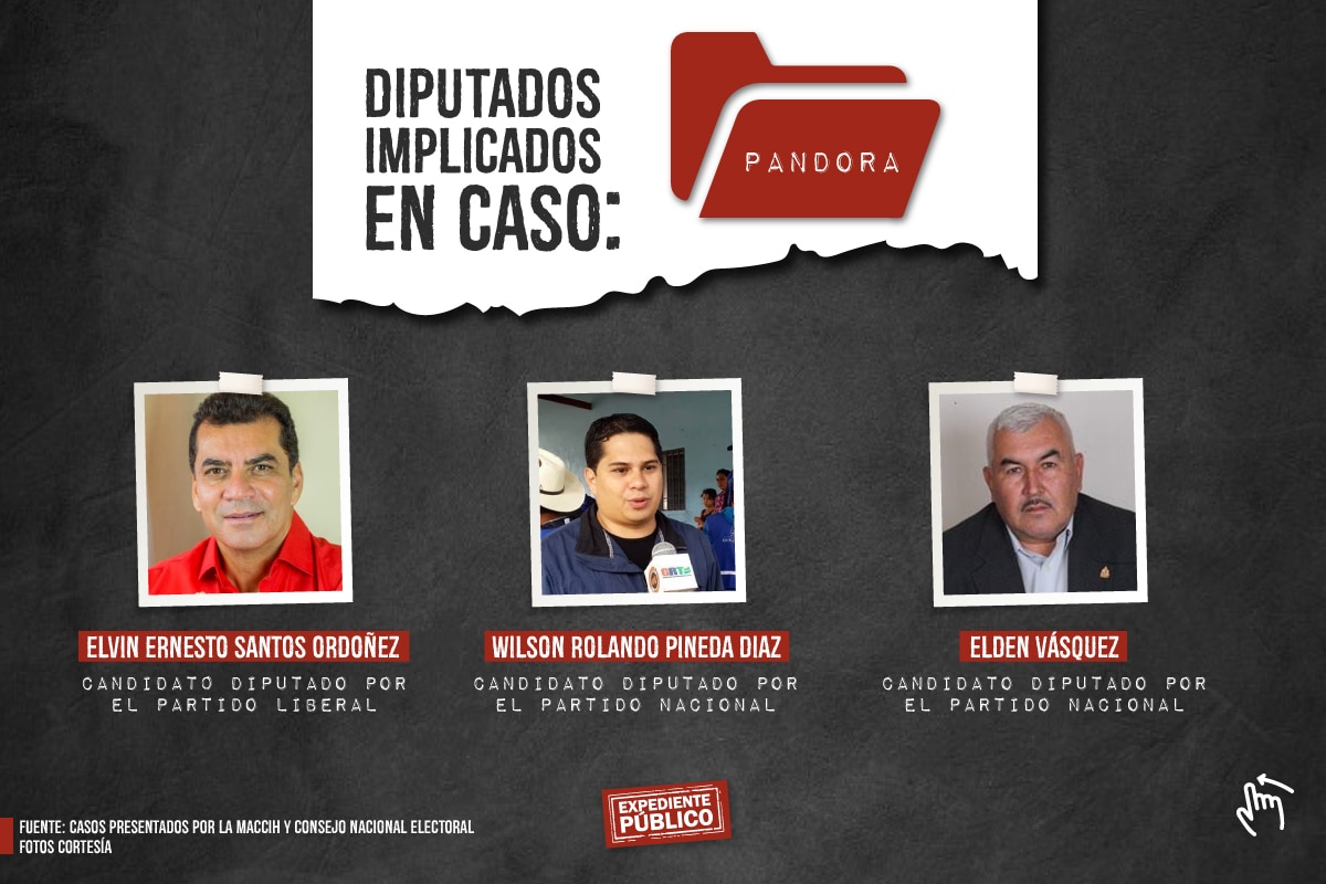 Del caso Pandora tres implicados participan como candidatos diputados: Elvin Ernesto Santos Ordoñez, en la posición tercera como candidato diputado por el Partido Liberal; Wilson Rolando Pineda Diaz va en la primera posición del Partido Nacional como candidato a diputado y Elden Vásquez, quien va en la segunda posición como candidato a diputado del Partido Nacional.