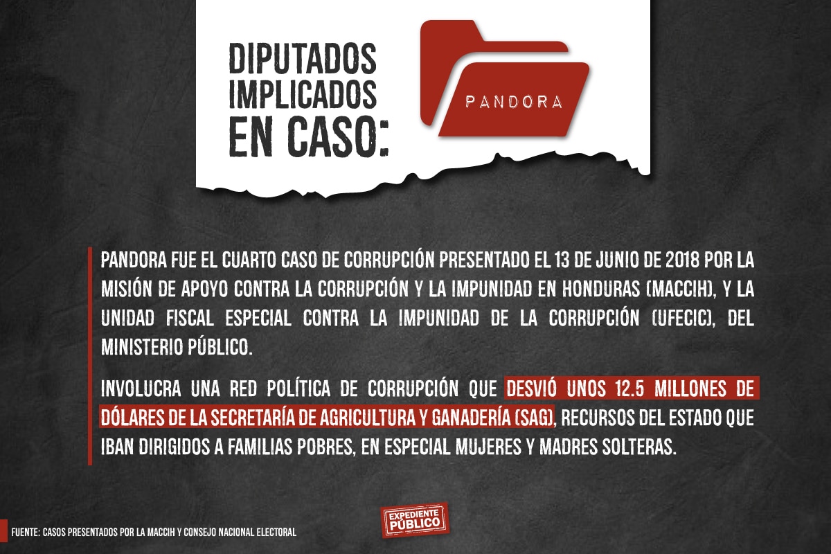 Pandora fue el cuarto caso de corrupción presentado el 13 de junio de 2018 por la Misión de Apoyo contra la Corrupción y la Impunidad en Honduras (Maccih), y la Unidad Fiscal Especial Contra la Impunidad de la Corrupción (Ufecic) del Ministerio Público.