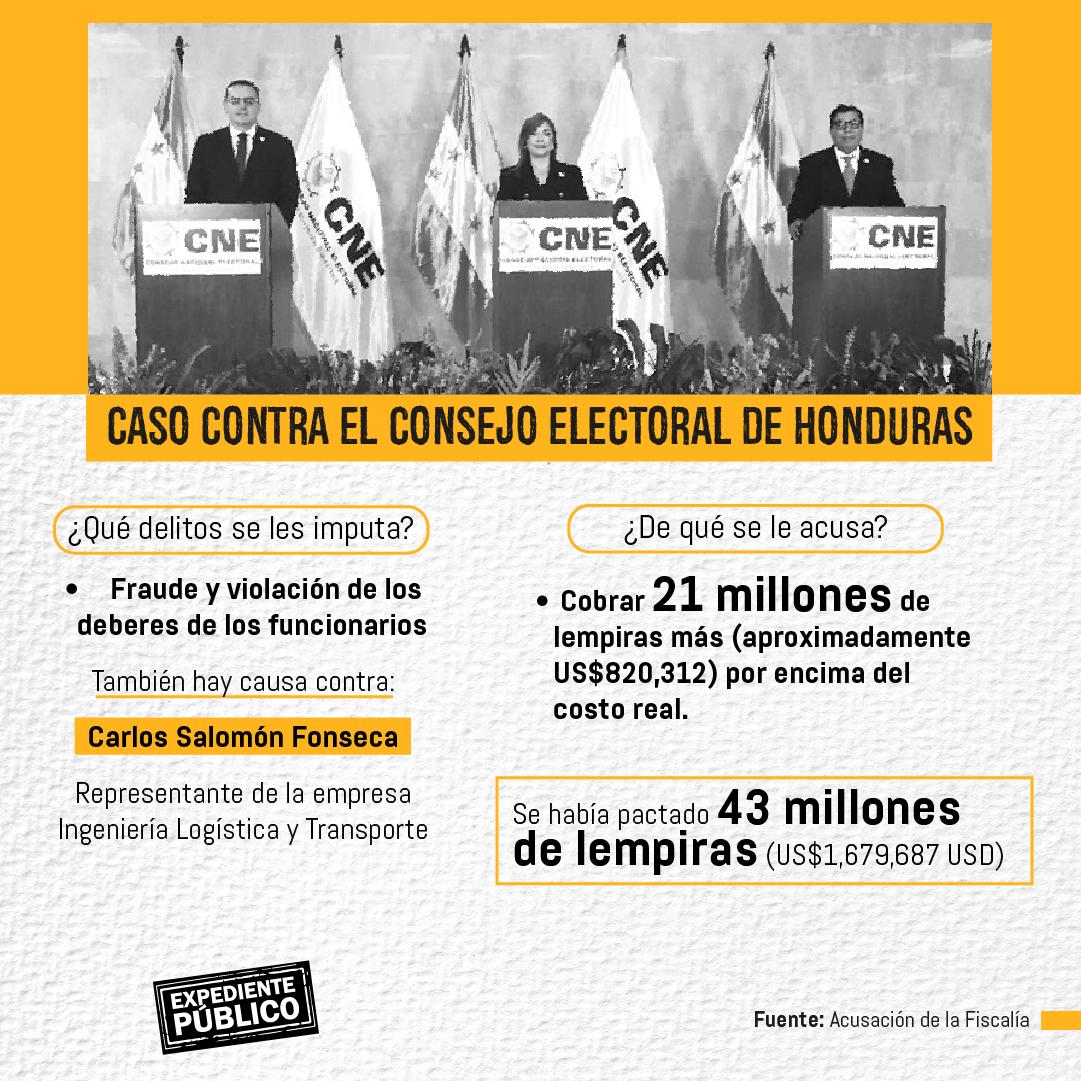 Ese estudio, según la fiscalía, afirmaba que el costo real del transporte debía ser 43 millones de lempiras (aproximadamente 1,679,687 dólares), pero la empresa que se contrató, Ingeniería Logística y Transporte S. de R.L cobró 64.7 millones de lempiras (unos 2,527,343 de dólares).