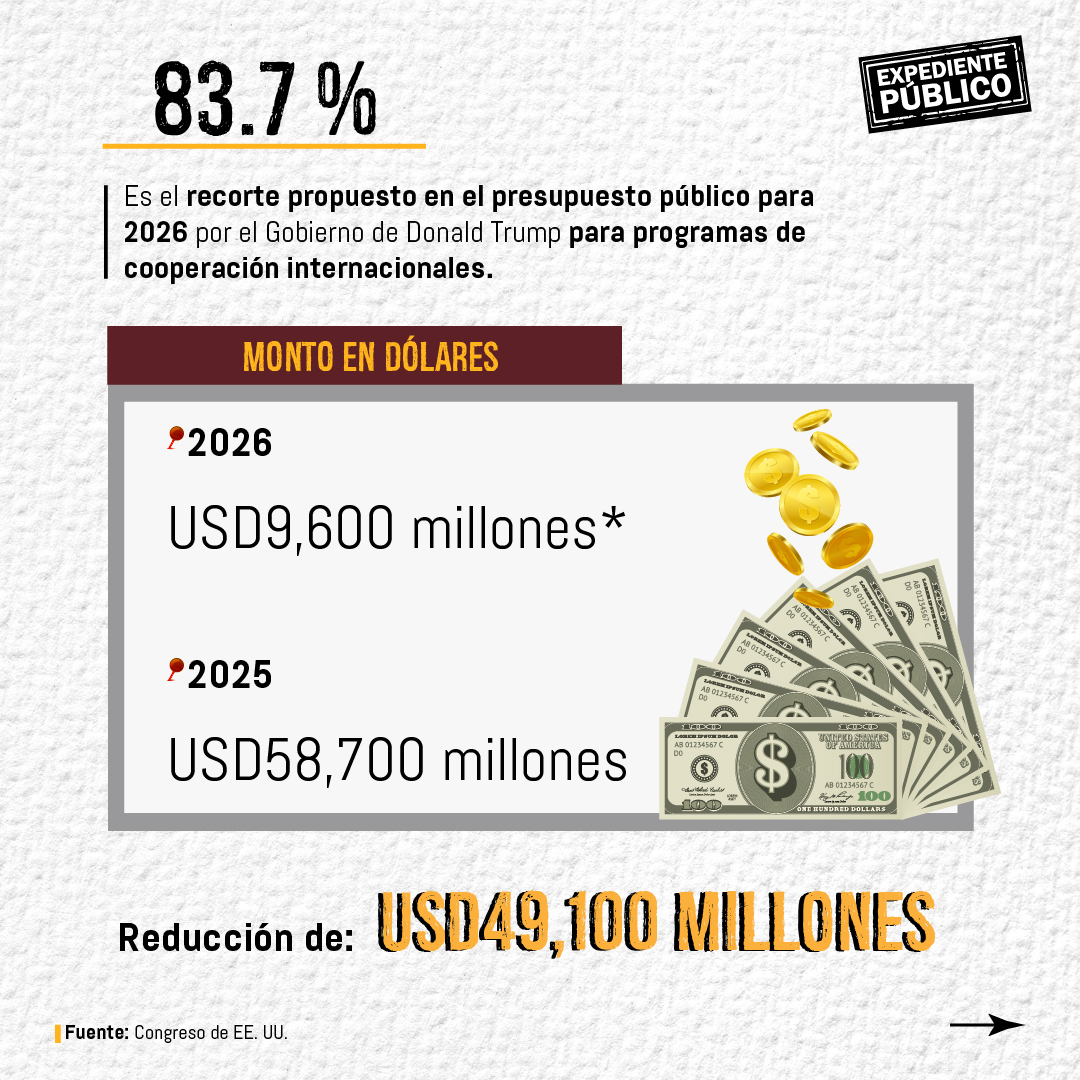 La propuesta de presupuesto público para 2026 del Gobierno de Donald Trump reduce 49.1 billones de dólares, 83.7% del total, de los fondos de asistencia para programas internacionales.