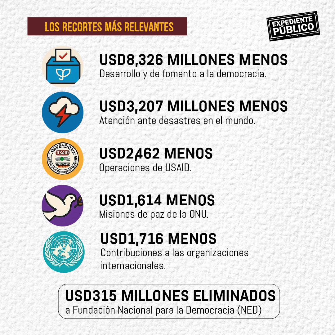 Los recortes son significativos: por ejemplo, se eliminaron 8,326 millones de dólares destinados a programas de desarrollo y promoción de la democracia. Además, 3,207 millones de dólares destinados a la respuesta ante desastres a nivel global.