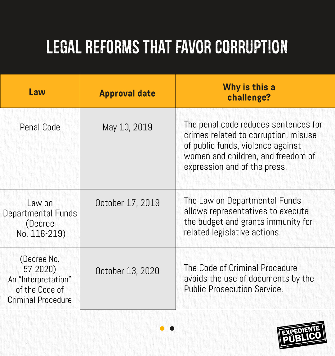 “There is a need to reform this decree, as there are cases of government officials who have been accused of corruption from the period of 2006 to 2009. While political will to reform the law has lacked due to the coup d’état in 2009, certain actors have avoided the consequences of their actions and the justice system,” Irías said to Expediente Público. Irías adds that “this reform is important to avoid any obstacles to an international commission that would seek to combat corruption.”