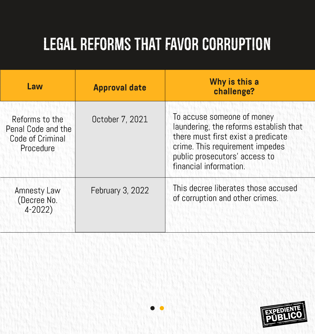 The reform “eliminates some of the predicate offenses necessary for money laundering charges,” says Irías. Before the reform, a person who appeared overnight as the owner of assets and bank accounts could be charged with money laundering to prove the licit origin of his or her wealth. Now, the Public Prosecution Service must first show that the person committed a crime (drug trafficking, misuse of public funds, etc.), through which he or she accumulated wealth, for the government to pursue charges.