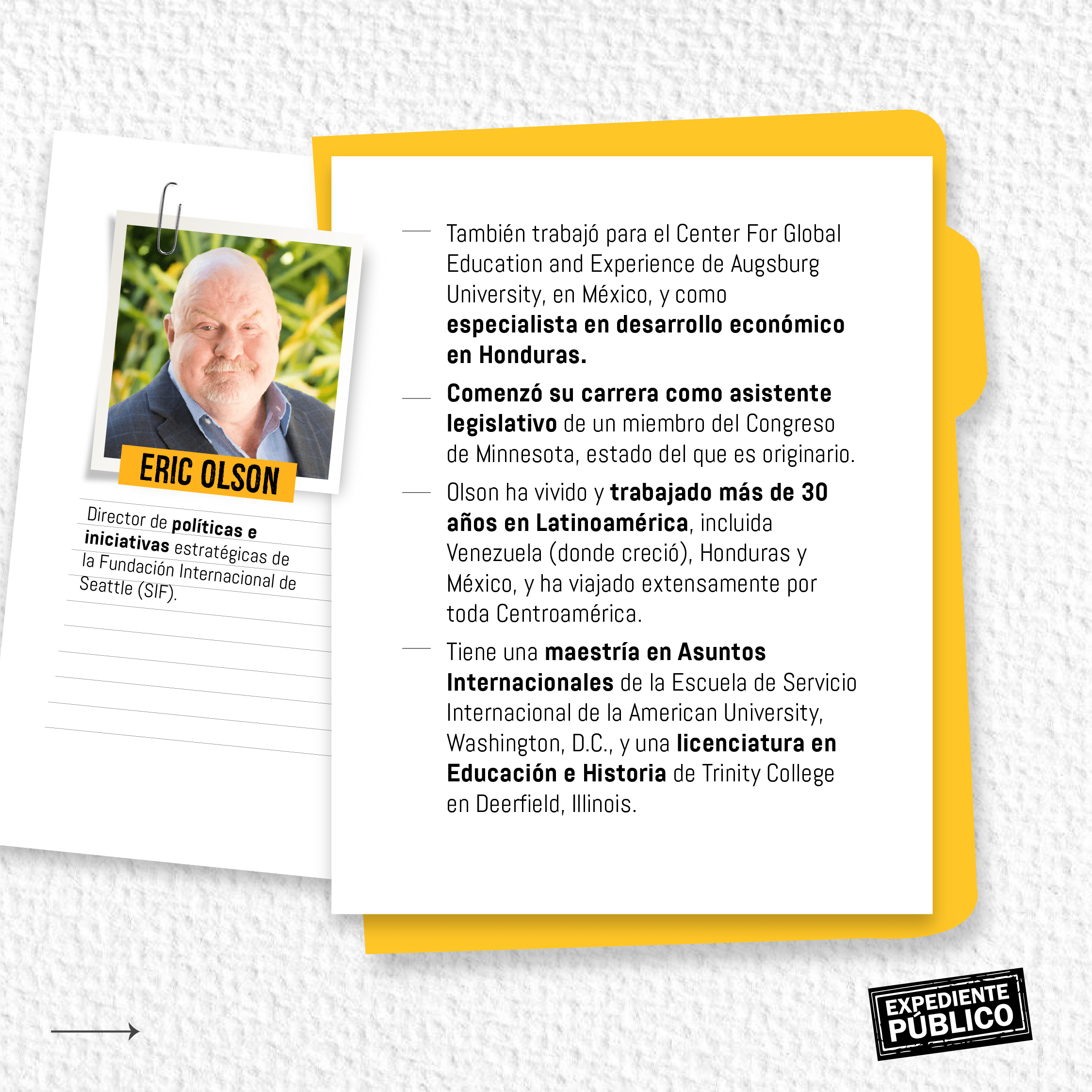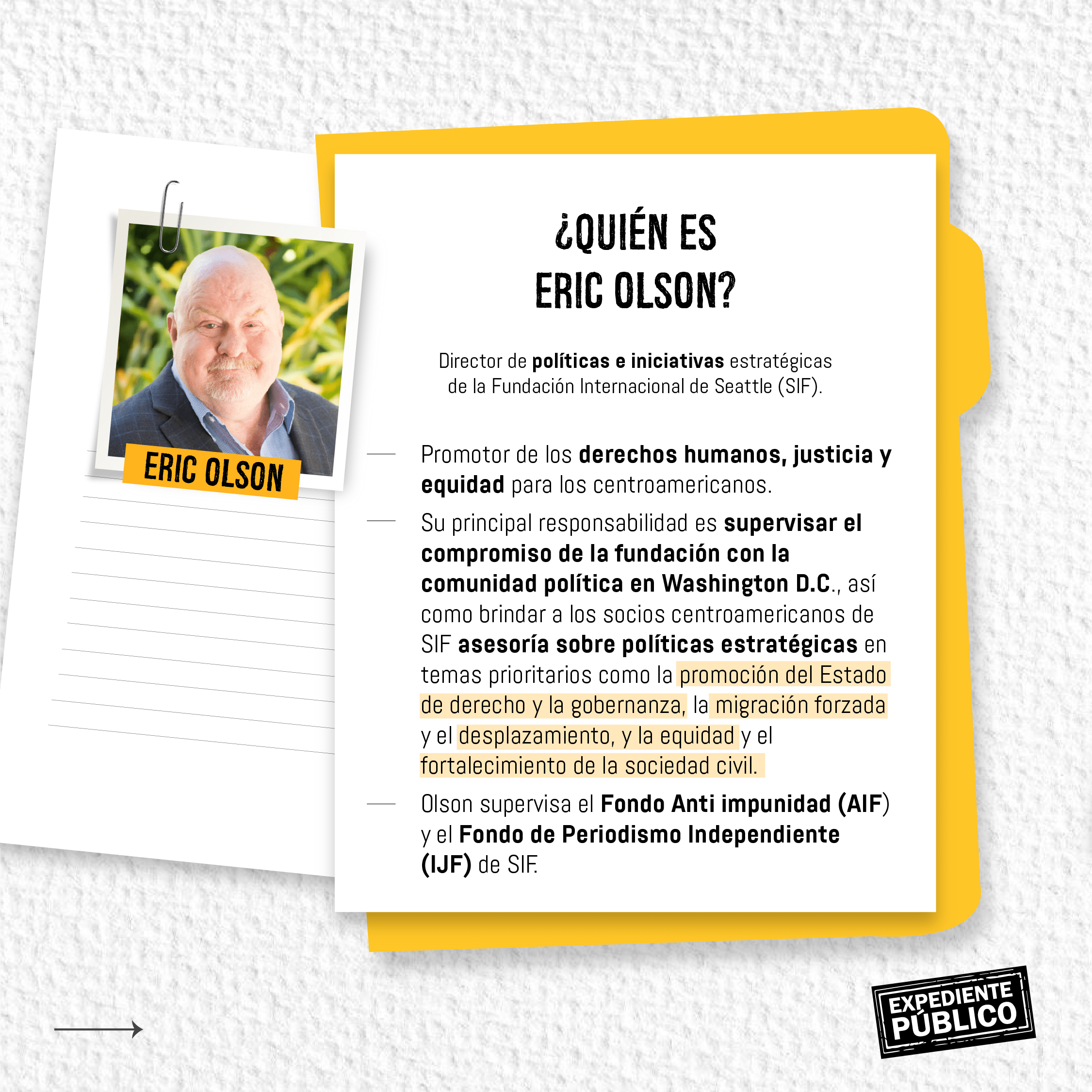 Protección de mujeres, activistas de los pueblos indígenas y defensores del medio ambiente, así como a la libertad de expresión, son los “grandes y profundos retos” a los que se enfrenta Honduras en el tema de Derechos Humanos (DD. HH), analizó a Expediente Público en una entrevista exclusiva, el director de políticas e iniciativas estratégicas de la Fundación Internacional de Seattle (SIF, por sus siglas en inglés) y miembro del Wilson Center, Eric Olson.